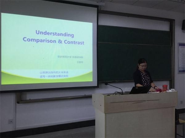 王爱琴老师讲授了一堂精彩的“大外英语读写教学课”课程,副院长朱忠焰、教研室主任吴祚安、熊捍东等陪同调研组成员观摩现场教学,并开展了评课活动。教学观摩活动结束后,调研组一行与我院领导班子以及教师代表就学院发展规划、学科建设、硕士点申报、大外英语教学改革、商务英语与翻译专业的发展与实践活动进行了深入交流。交流中,副院长王先荣就学科教学(英语)研究生教学工作作了系统介绍,熊捍东老师对师范生课堂教学改革作了专题汇报。(熊捍东)