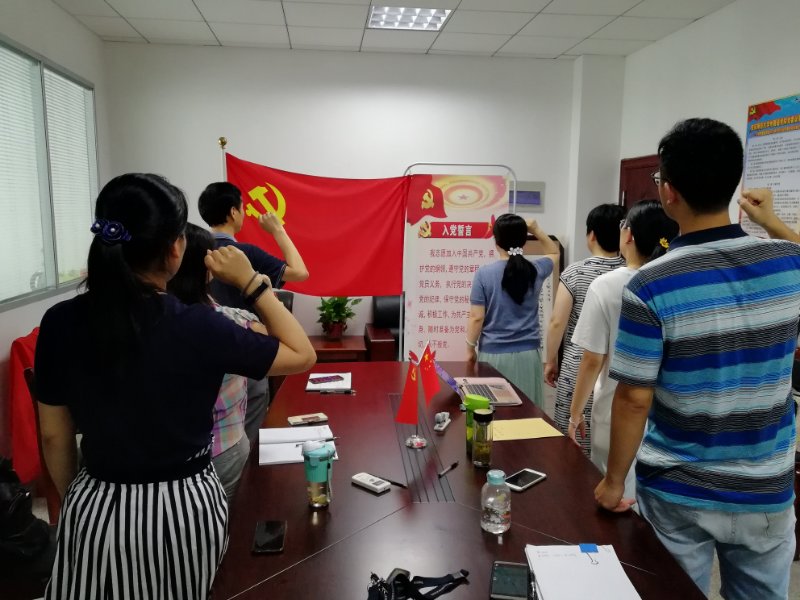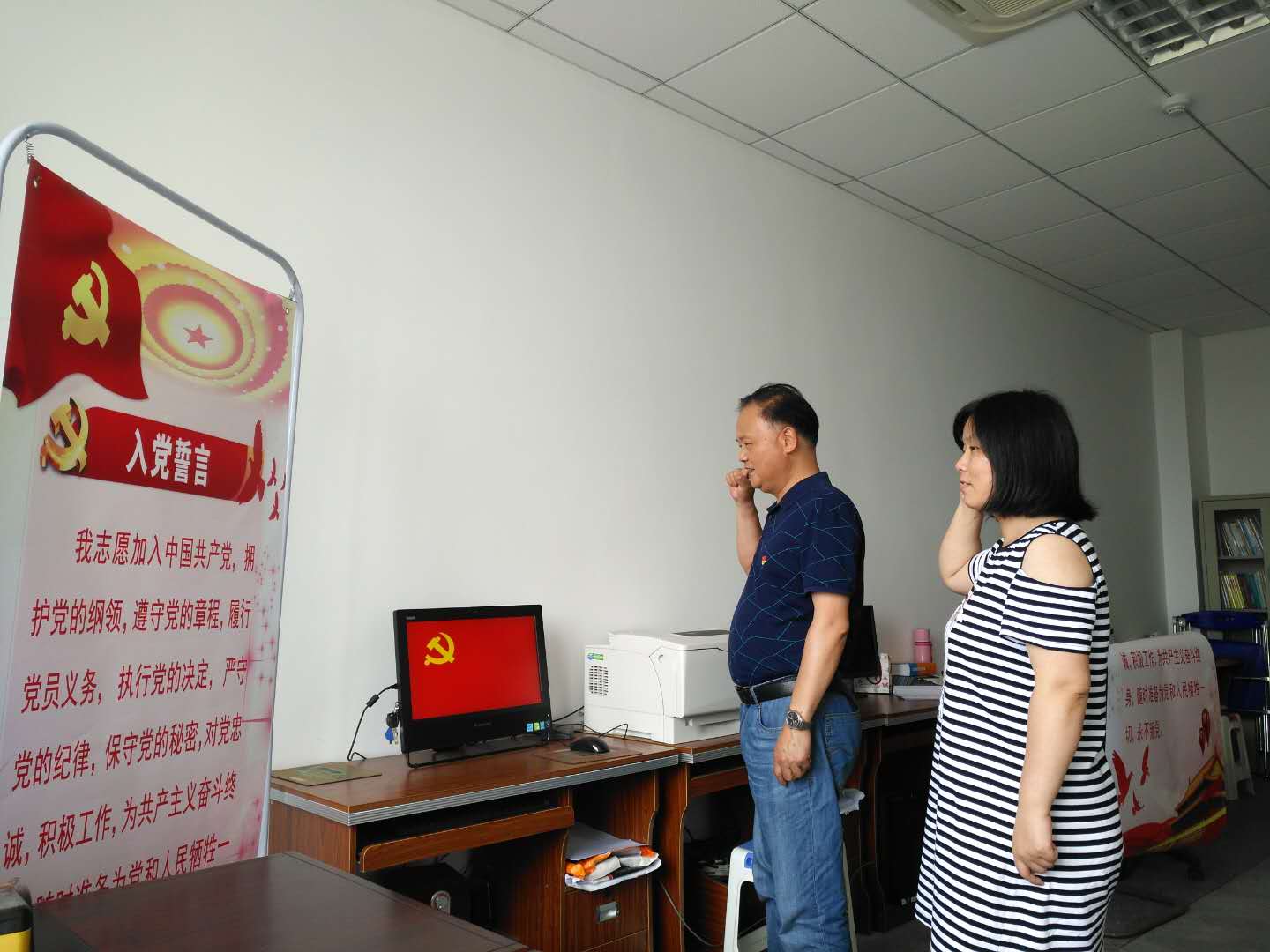 党委书记郝涂根为2019年发展的23名新党员佩戴党员徽章。“我志愿加入中国共产党,拥护党的纲领……”,在郝涂根的带领下,学院百余名师生党员在庄严的党旗下举起右手,重温入党誓词,坚定理想信念、铭记使命担当。掷地有声的铮铮誓言响彻外语大楼。
