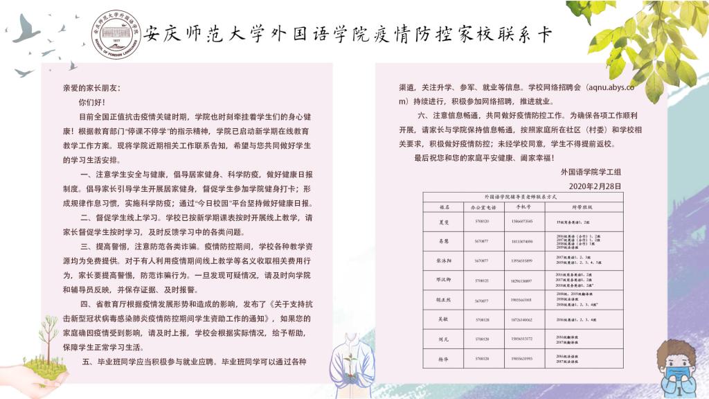 倡导学生居家健身;督促学生线上学习;注意防范各类诈骗;上报受疫情影响情况;注意信息畅通......这些都是家校联系卡上学院对广大家长的建议,卡上还明示出每一位学生辅导员的联系方式。爱情岛论坛