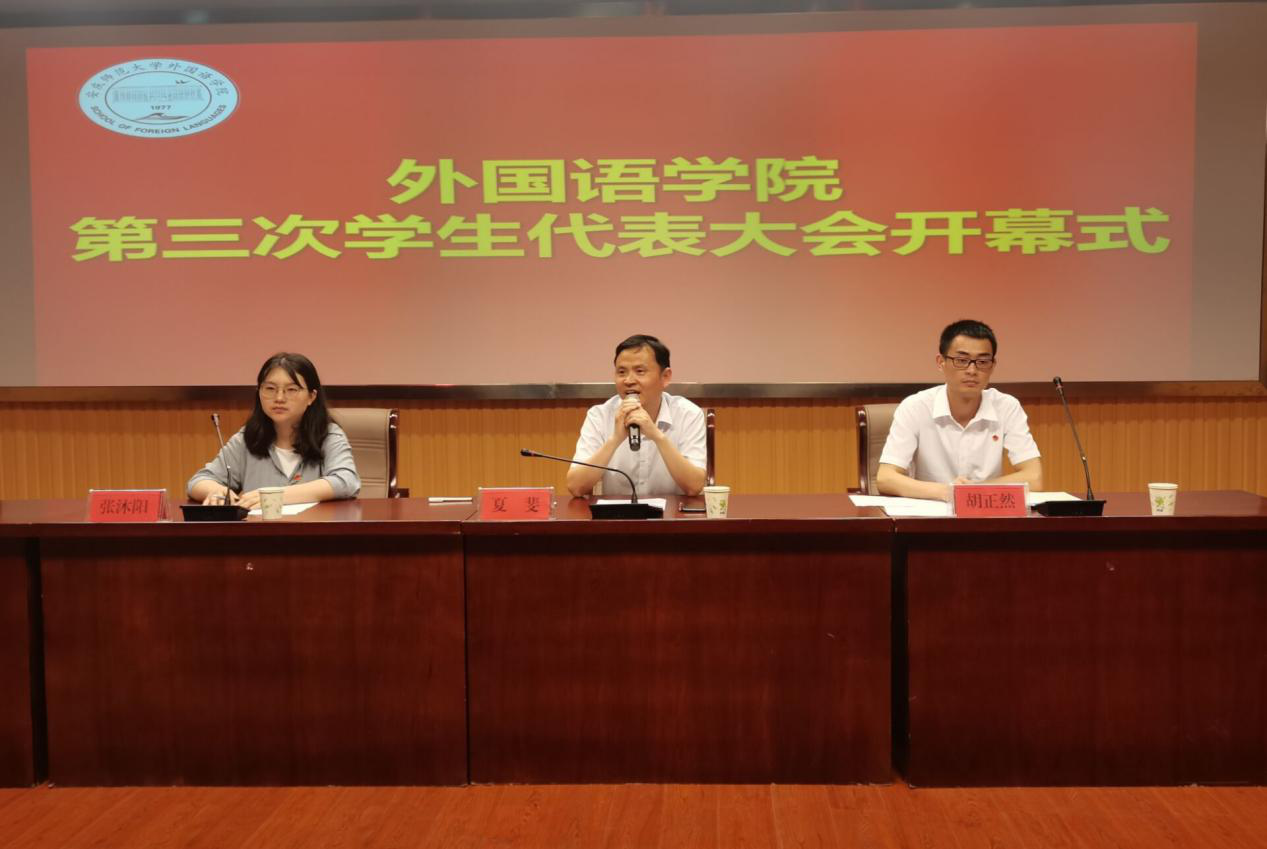 在庄严的国歌声中大会开幕。夏斐在大会上讲话,他进一步解读了学院学生工作的育人理念“培德筑魂,强能善行”,向学生干部详细介绍了“重引领、重基础、重实践、重能力”的工作思路和正在推进的“培德、导航、读书、双创、榜样”五大工程,要求学生会能围绕中心工作,分层分类推进。他建议大一同学注重认知教育,提升适应能力;大二同学注重专业引领,提升专业能力;大三同学注重双创教育,提升实践能力;大四注重责任教育,提升就业能力。最后,他向学生骨干提出三点希望,一是坚定理想信念,听党话,跟党走,要做广大学生的榜样;二是脚踏实地,提升自身能力,争做团学工作的骨干;三是敢创敢为,善思考,勤实践,学做人生的强者,为同学做实事。
