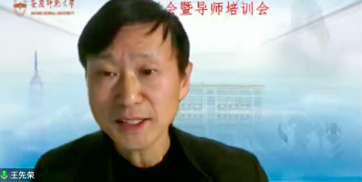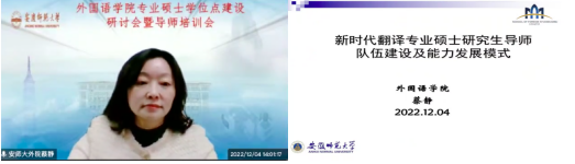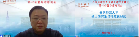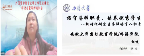 为深入学习宣传贯彻党的二十大精神,推进新时代研究生教育高质量发展,建设高素质研究生导师队伍,提升研究生导师指导水平,全面落实研究生导师立德树人职责,夯实我院翻译硕士和学科教学(英语)专业学位硕士点建设基础,12月4日下午外国语学院在腾讯会议平台召开硕士学位点建设研讨会暨硕士生导师培训会。安徽大学国际教育学院院长胡健教授、安徽师范大学爱情岛论坛