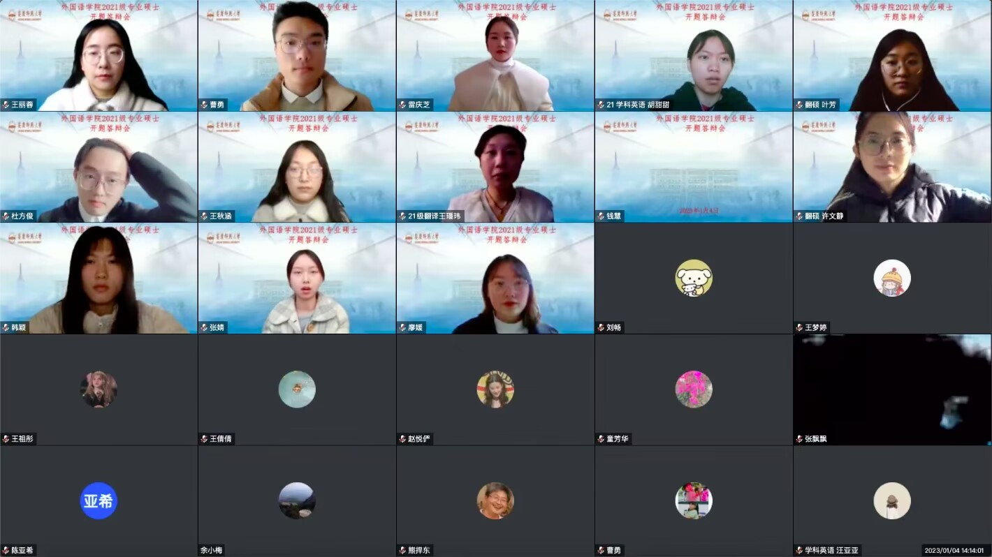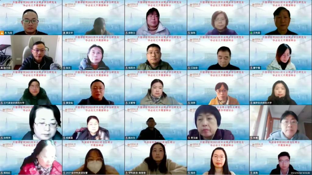 为了加强研究生培养过程管理,保障研究生培养质量,提升研究生学位论文水平,我院于2023年1月4日举行了2021级专业学位硕士研究生学位论文开题答辩会,会议以腾讯会议形式在线进行。2021级学科教学(英语)和翻译硕士两个专业领域的29名同学分成7个答辩小组进行了答辩,25位导师担任答辩小组专家。