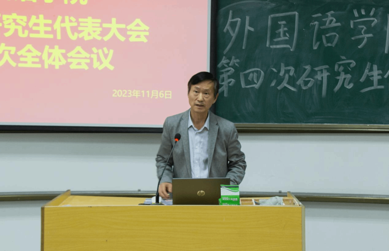 会议在庄严的国歌声中拉开序幕,王先荣教授对大会的召开表示热烈祝贺,他充分肯定了我院研究生代表在思想引领、校园文化、社会实践、创新创业等方面所做出的重要贡献,并对我院研究生学子提出了四点殷切期望:一是希望外院青年坚定理想信念,勇担青春使命,争当有理想、敢担当的时代先锋;二是希望外院青年增长见识,丰富学识,践行知行合一、锐意开拓创新,争当能吃苦、肯奋斗的青春模范;三是希望外院青年实现思想成长、学业进步、身心健康有机结合,立志成为德智体美劳全面发展的社会主义事业合格建设者和可靠接班人。