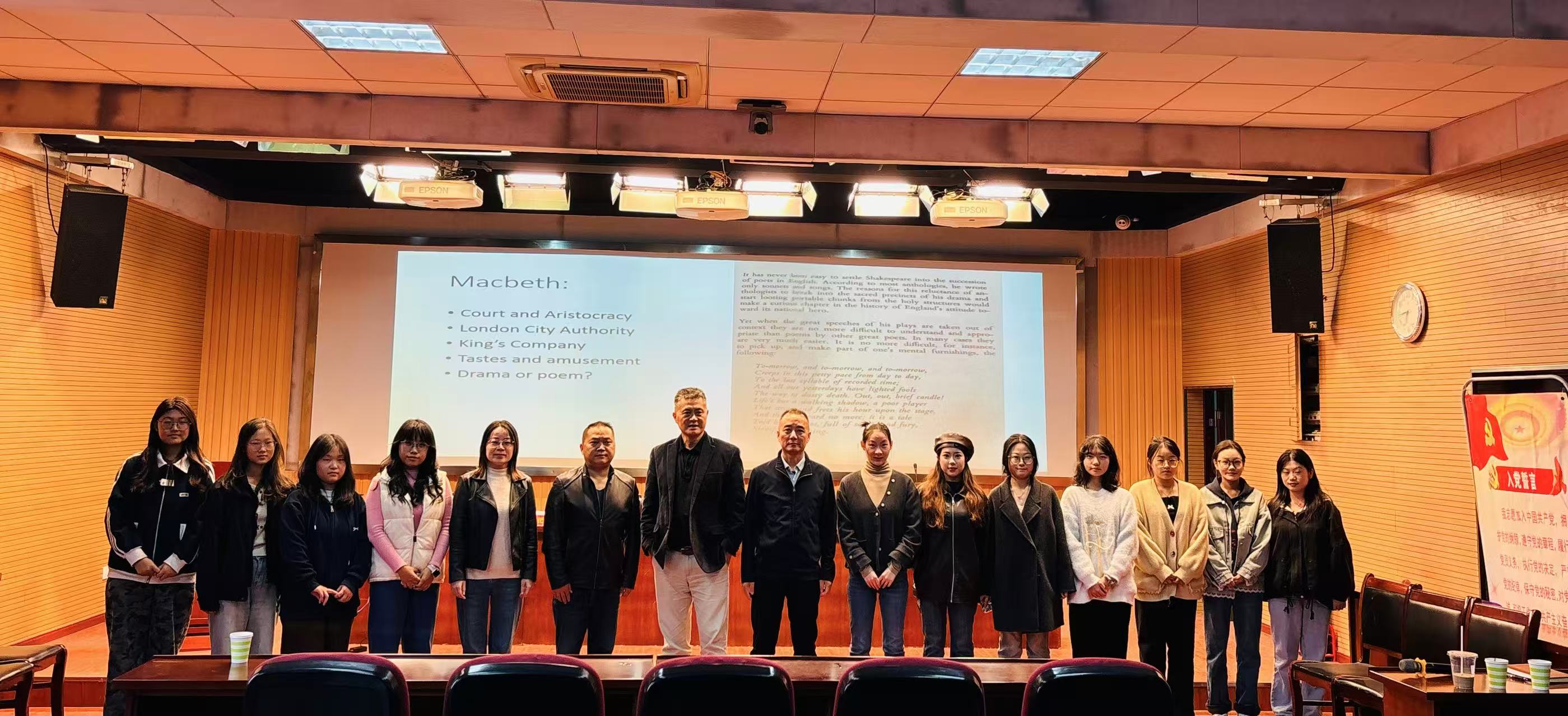 把嶙从莎士比亚“走出小镇、投身大城”的人生转折切入,结合自身留学与教学经历,鼓励学生跳出熟悉的生活轨道,主动拥抱更广阔的世界。他通过莎剧中广为传诵的“To be or not to be”引导听众深入思考人性与命运的张力,并围绕十四行诗中的情感意象、身份隐喻及其艺术表达,引发对文学与现实关系的再认识。讲座内容深入浅出,语言生动,逻辑清晰,学生反响热烈,现场提问踊跃,把嶙耐心回应,并勉励青年学子在经典阅读中不断拓展视野、锤炼思维、理解人生。与会师生纷纷表示受益良多。