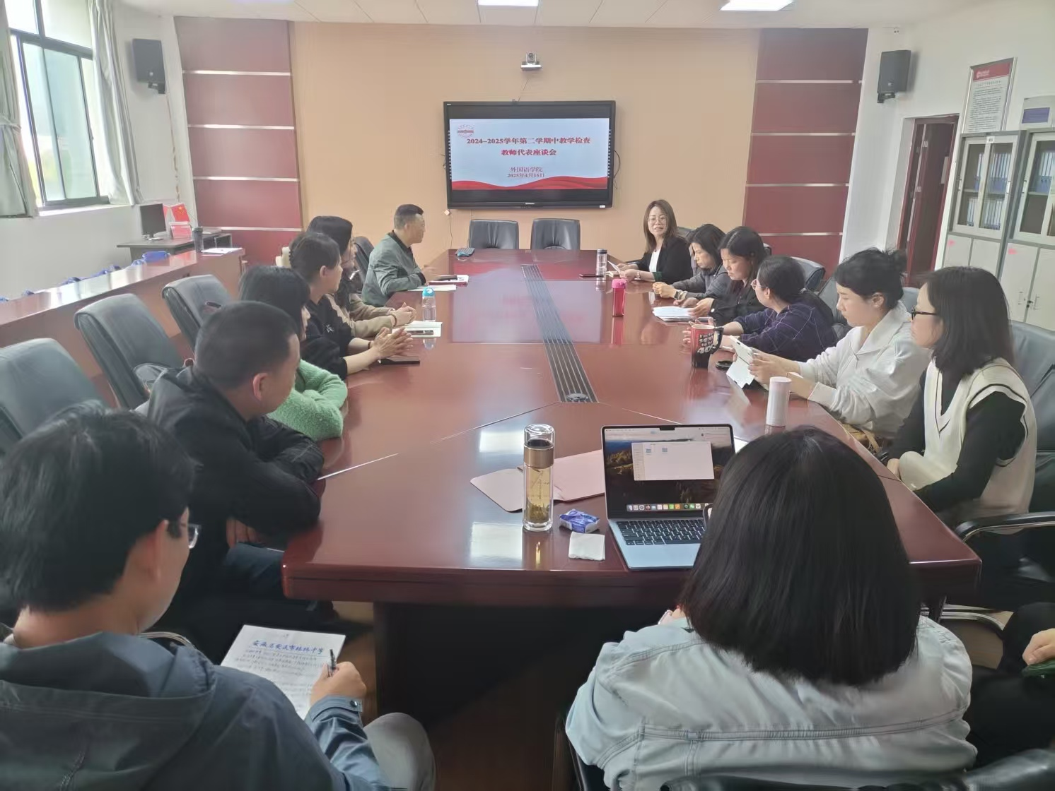于4月中下旬分别在 E304 会议室和 E314 教室召开期中教学检查师生代表座谈会。学院党委副书记、副院长、专业课和公共课教师代表、非英语专业学生代表以及外语类专业学生代表参加了会议。