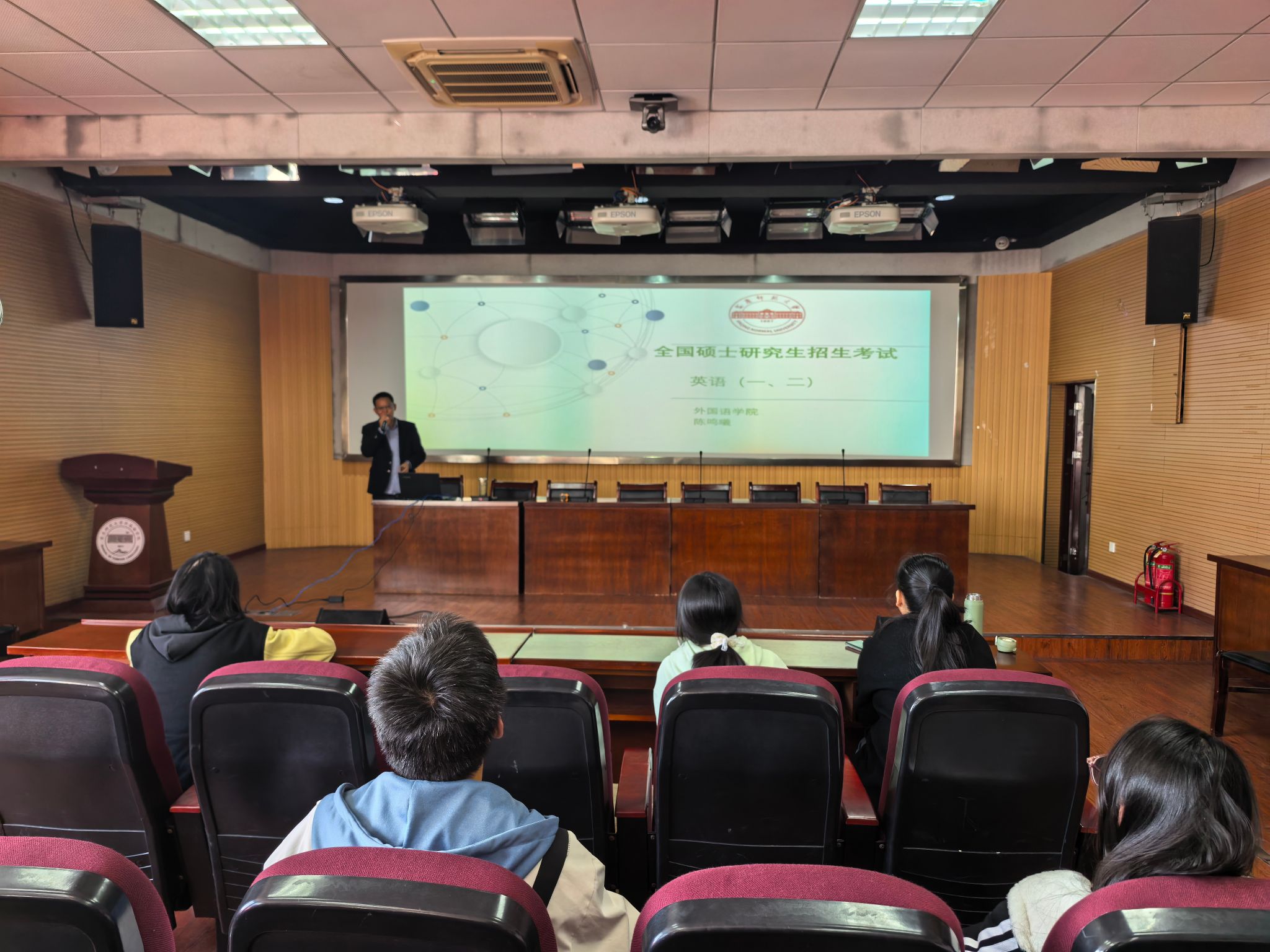 在E503报告厅举办“科学备考体系搭建与实战演练”考研英语专题辅导讲座。本次讲座特邀学院骨干教师陈鸣曦博士主讲,旨在精准对接全校考研学子诉求,提供高质量、针对性强的英语考前指导服务。