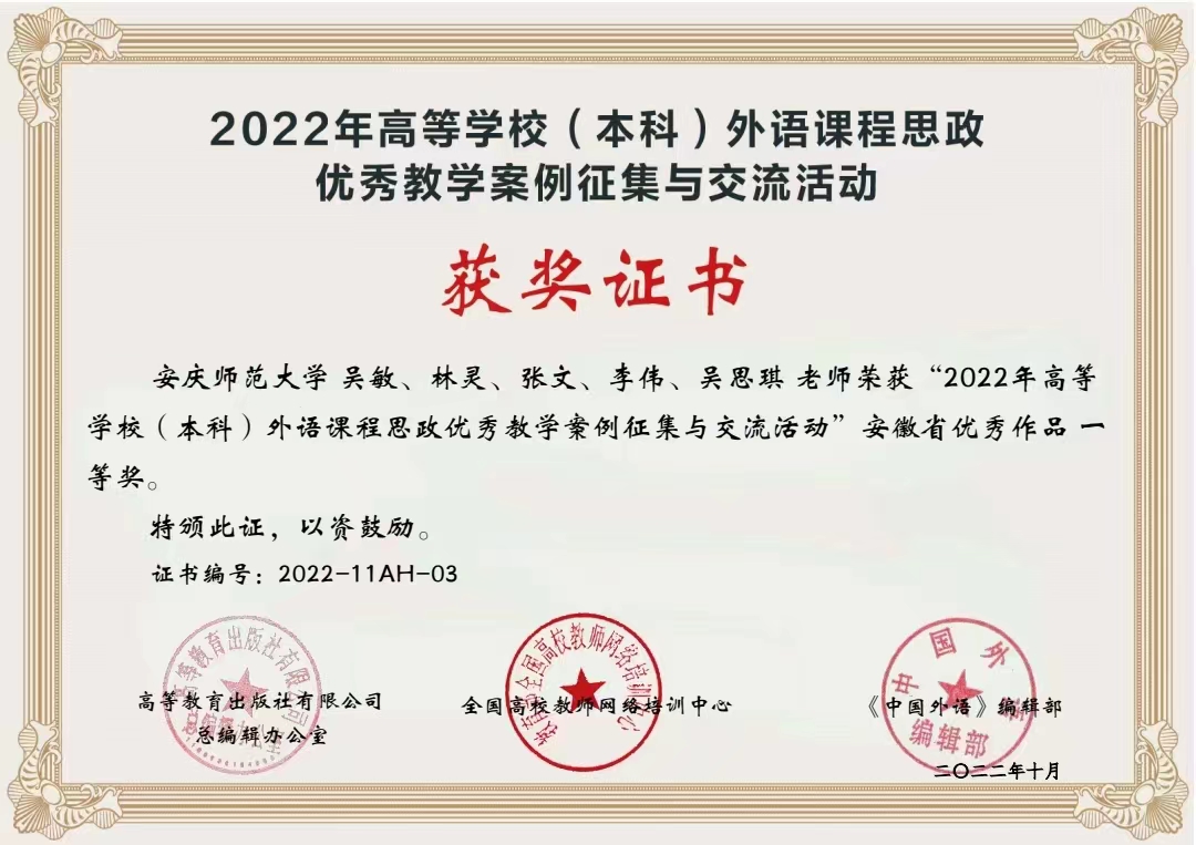 大学英语课程思政教学团队吴敏、林灵、张文、李伟、吴思琪报送的案例荣获安徽省优秀作品一等奖。