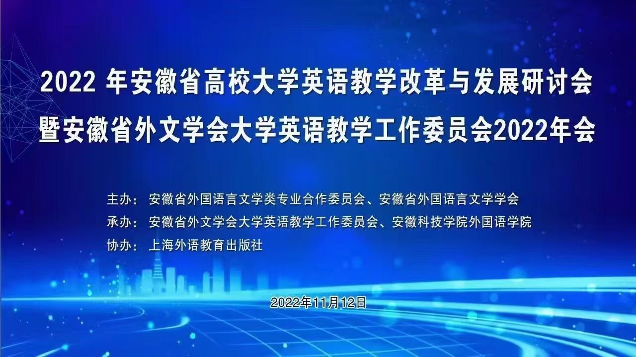 在全国上下深入学习宣传贯彻党的二十大精神之际,2022年安徽省高校大学英语教学改革与发展研讨会于11月12日在线举行。本次会议由安徽省外国语言文学类专业合作委员会、安徽省外国语言文学学会主办,安徽省外文学会大学英语教学工作委员会和安徽科技学院爱情岛论坛