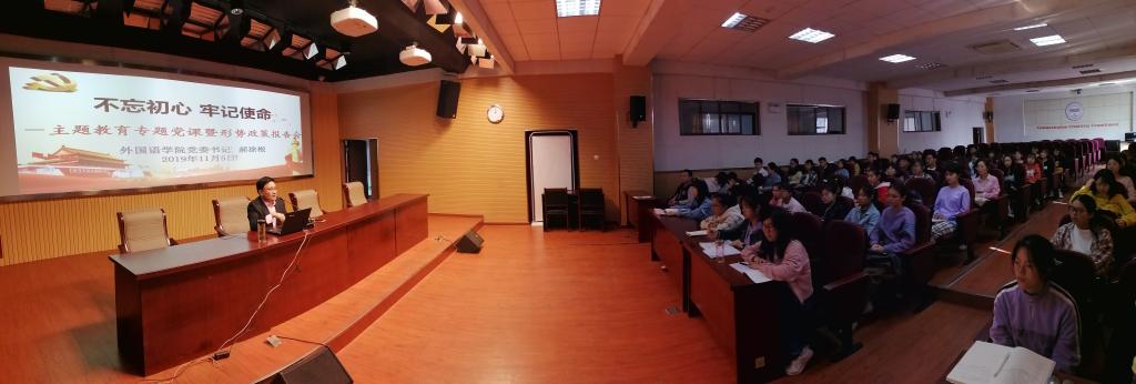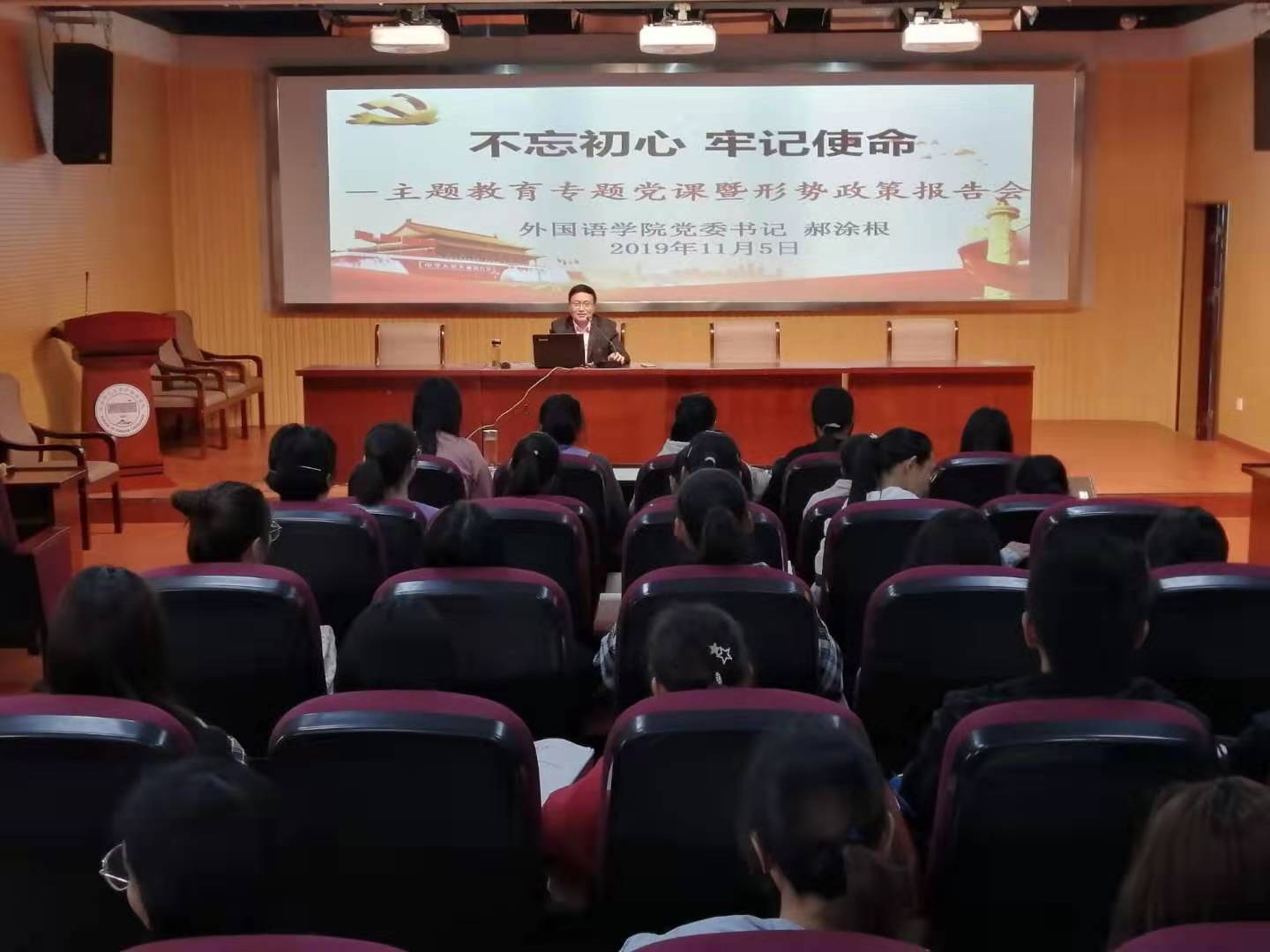 党委举行主题教育专题党课暨形势政策报告会,党委书记郝涂根为支部书记、学生党员及第60期入党积极分子培训班学员作了一场《“不忘初心、牢记使命”,争做有为的新时代青年》专题党课。
