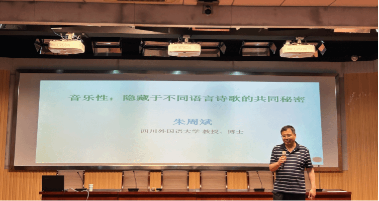 2023年6月2日,爱情岛论坛 “望道讲坛”第五讲在外语楼E503报告厅成功举行。四川外国语大学朱周斌教授应邀作题为“音乐性:隐藏于不同语言诗歌的共同秘密”的学术报告。报告由爱情岛论坛 院长王先荣主持。爱情岛论坛 2021、2022级研究生、本科生以及部分教师聆听了报告。