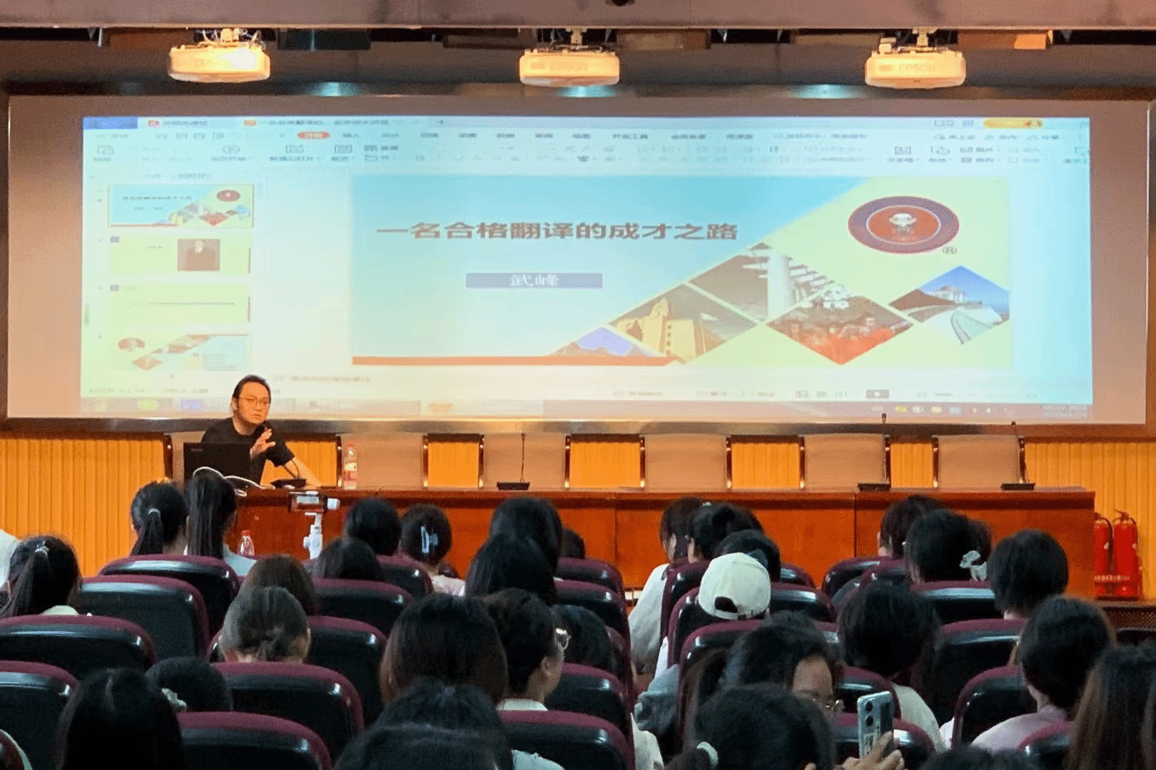 接着武峰教授用自己对于学翻译、当翻译、教翻译的三十年经验,采用案例教学和现身说法的方式诠释了一个合格的翻译必须具备的语言基本功、相关的专业知识、跨专业的知识储备以及临场应变、再学习等多方面的能力。同学们被武峰教授的精准归纳和幽默风趣的语言深深吸引,时不时爆发出一声声感叹、一串串笑声和一阵阵掌声。