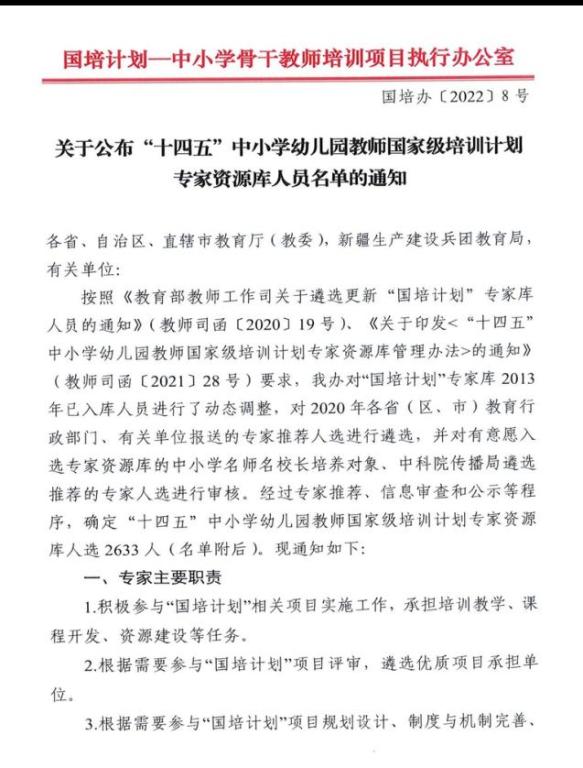 据悉,为贯彻落实《中共中央国务院关于全面深化新时代教师队伍建设改革的意见》,加强教师培训者队伍建设,支持“十四五”时期“国培计划”高质量实施,按照《教育部教师工作司关于遴选更新“国培计划”专家库人员的通知》(教师司函〔2020〕19号)、《关于印发<“十四五”中小学幼儿园教师国家级培训计划专家资源库管理办法>的通知》(教师司函〔2021〕28号)要求,教育部依托“国培计划”—中小学骨干教师培训项目执行办公室开展了“十四五”中小学幼儿园教师国家级培训计划专家资源库人员遴选更新工作。经过专家推荐、信息审查和公示等程序,确定“十四五”中小学幼儿园教师国家级培训计划专家资源库人选2633人。入选专家将承担“国培计划”项目培训教学、课程开发、资源建设等任务,并根据需要参与“国培计划”项目规划设计、政策与标准研制、项目评审、项目调研、跟踪指导与质量评估等工作。