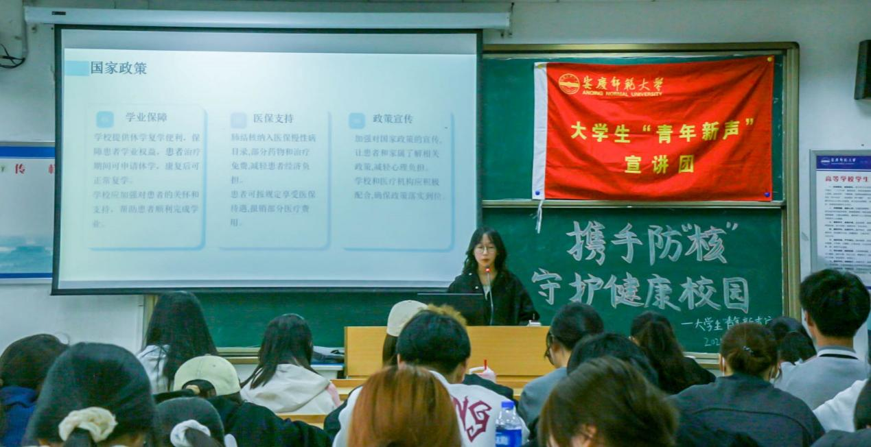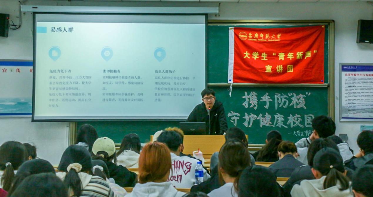 在E314举办肺结核防护宣讲会,由大学生“青年新声”宣讲团进行宣讲,吸引学院百余名学生参加。