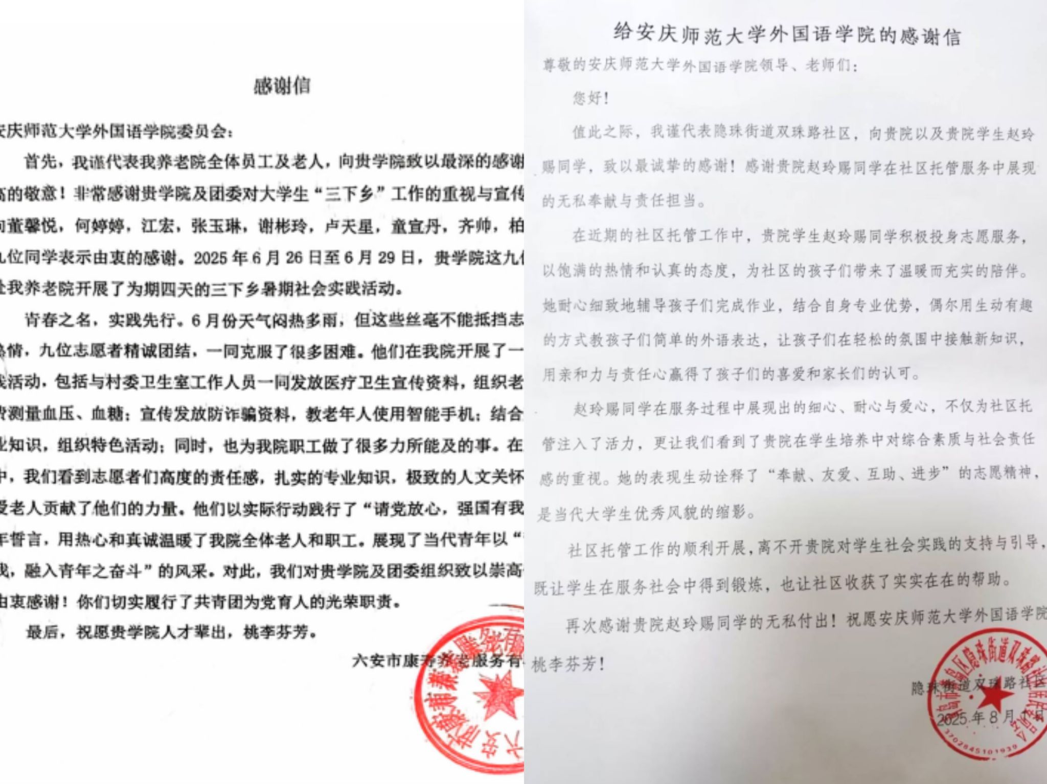 陆续收到来自共青团桐城市委员会、共青团安庆市宜秀区委员会等多地实践单位发来的表扬信与通报文件,对学院学生在2025年暑期“三下乡”社会实践活动中展现出的优良综合素质、扎实语言功底、奉献精神与责任担当予以高度评价和通报表扬。