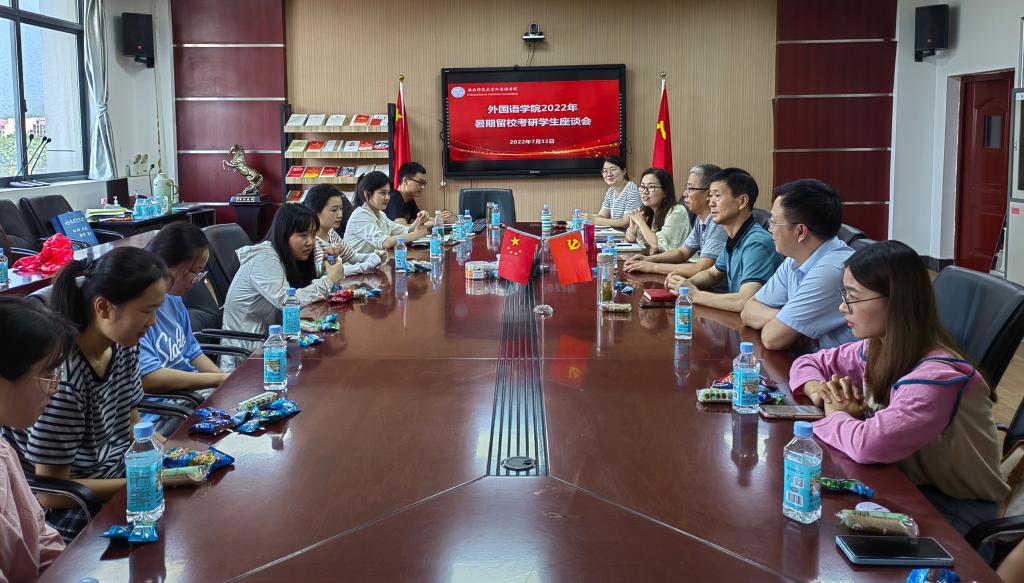在E304会议室召开暑期留校考研学生慰问座谈会。学院党委书记李亦亮、院长王先荣、副书记王惠、副院长黄全灿及全体学工组老师出席会议,留校学生代表参加本次座谈会。