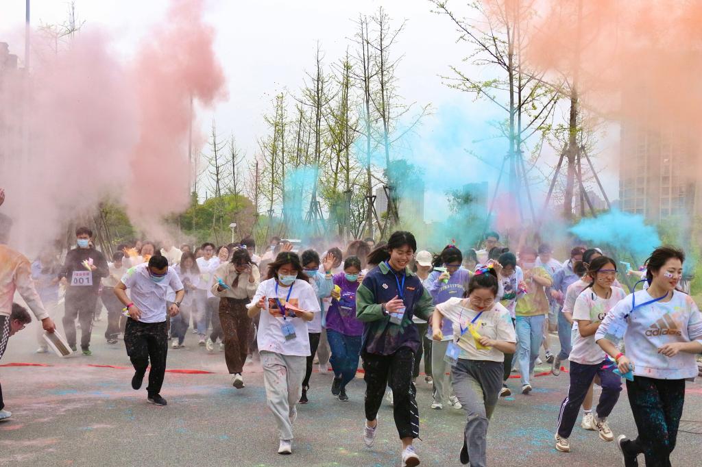 楼门前格外热闹,原来是该学院在开展“七彩青春”活力彩虹跑活动,100余名手腕系有七彩飘带的学生在尽情泼洒彩虹粉,他们化身“彩虹人”,在校园里热血开跑。