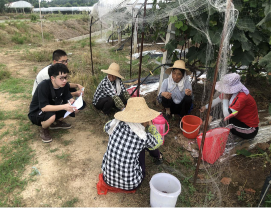 、传媒学院不同专业的8名队员组成,他们分成两组开展实践调研活动。其中一组前往当地居民点对居民就乡村振兴战略进行问卷调查,另外一组前往蓝莓园、皖国葡萄园等农特产业基地向相关负责人了解当地特色农业发展情况。