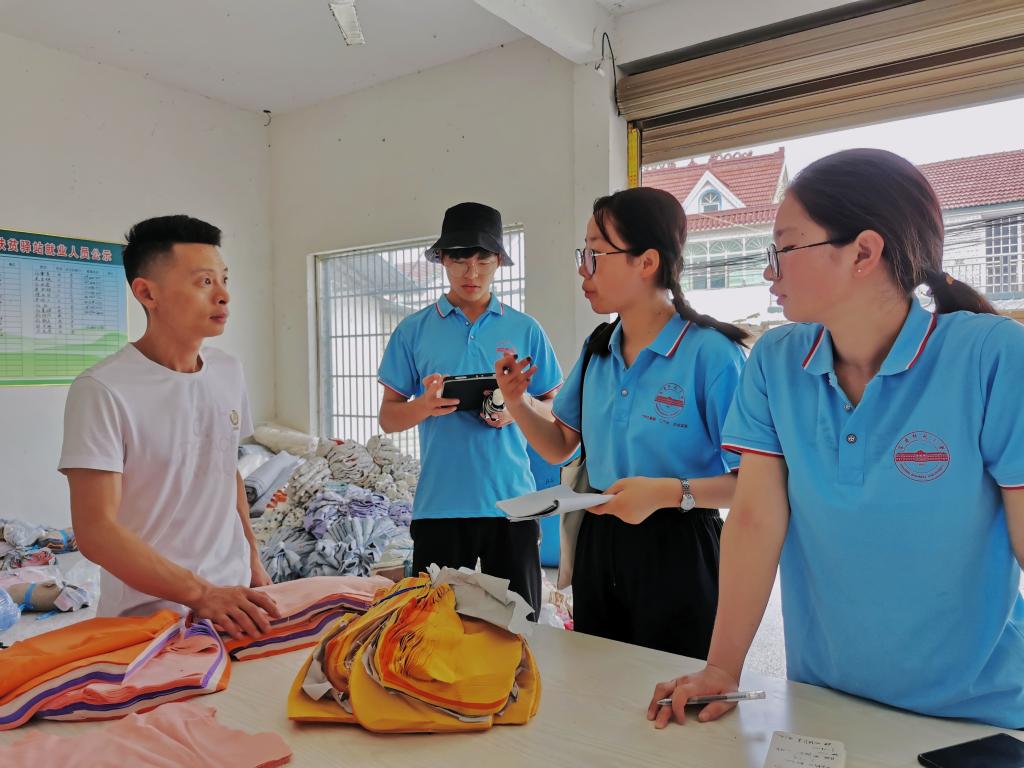 在制衣厂,对齐、踩踏、缝纫……队长吕成慧融入服装工人队伍,与工人们聊起家常。针对企业激励机制、技能培训、设备更新等问题进行采访,工人们积极讨论,热心回答,不少工人表示服装厂在当地经验丰富,有较好的发展前景,但因为资金、质量等问题,一直呈现分散式村落化发展模式,很难进行规模化转型。“在与工人们交谈的过程中收获颇丰,从劳动者的角度,为特色产业发展提出建议,发现问题,解决问题。”吕成慧说。