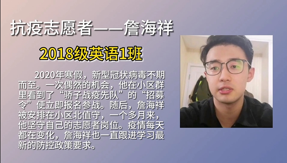 无论是防疫志愿者为抗击疫情的无私付出,还是先进青年的奋斗历程,都让在屏幕前观看视频的同学们受益匪浅。2019级英语(4)班的周馨悦说:“身为当代青年,我们应传承五四精神,自强不息,奋斗不止。”(青年媒体中心翟冉)
