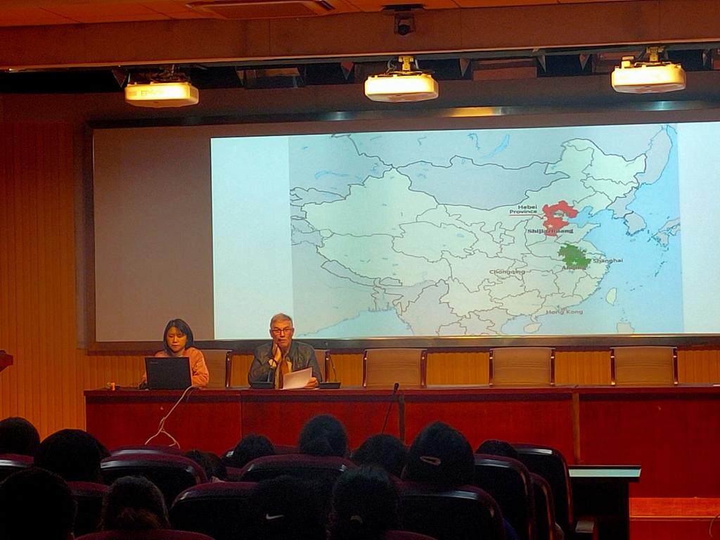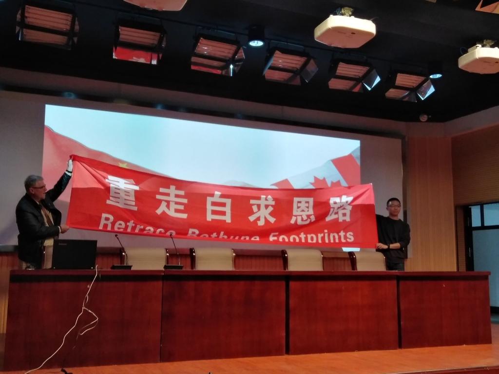 的学子们准备了这场讲座。本场报告以中加友谊为主题,首先对白求恩同志生平事迹作了简单介绍;紧接着,Stephen详细描述了他探寻白求恩之旅。最后,Stephen强调重走白求恩路,源于中加友谊,亦源于与安庆师大的情谊。