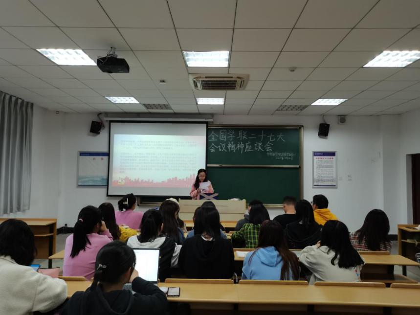 于E206召开学习贯彻落实全国学联二十七大会议精神座谈会,学院全体团学骨干到场参会。