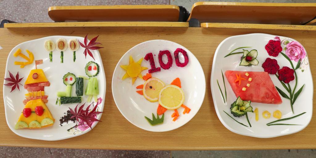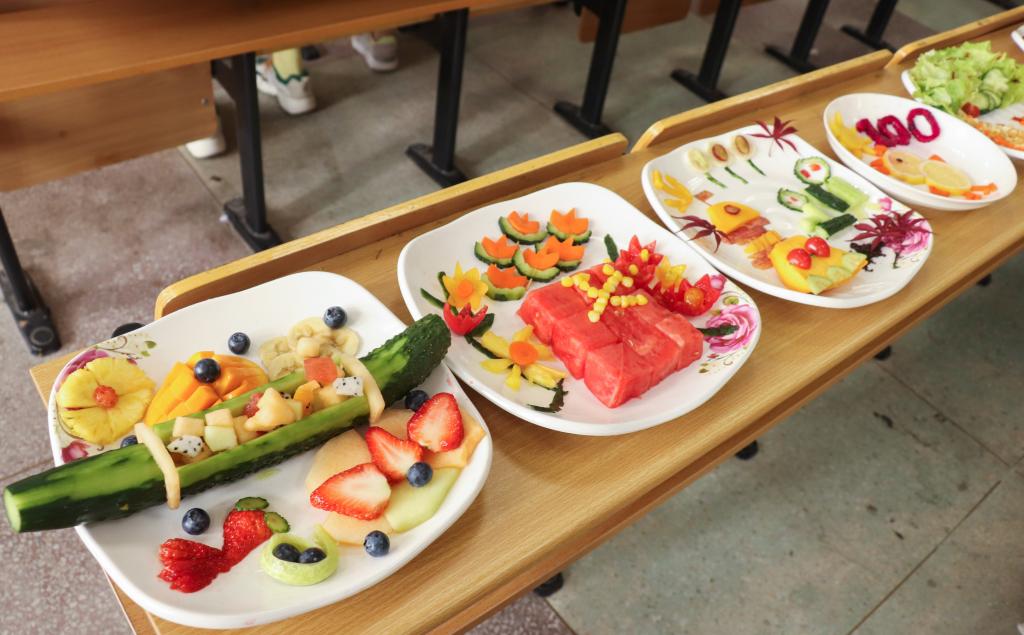 不同于其他组在拼盘中只使用水果,《最美的花儿献给党》这一作品中加入了玉米粒。“从前生活条件艰苦,革命先辈们大多只能吃上粗粮,加入玉米粒是希望大家能够牢记今天的幸福生活来之不易,懂得忆苦思甜。”外国语言文学类专业2020(4)班的何子旭解释。该组水果拼盘以切块西瓜为底、玉米粒作装点摆出党旗,用各种蔬果雕刻出的花朵环绕周围,象征着新一代社会主义接班人会一直坚定不移地跟党走。