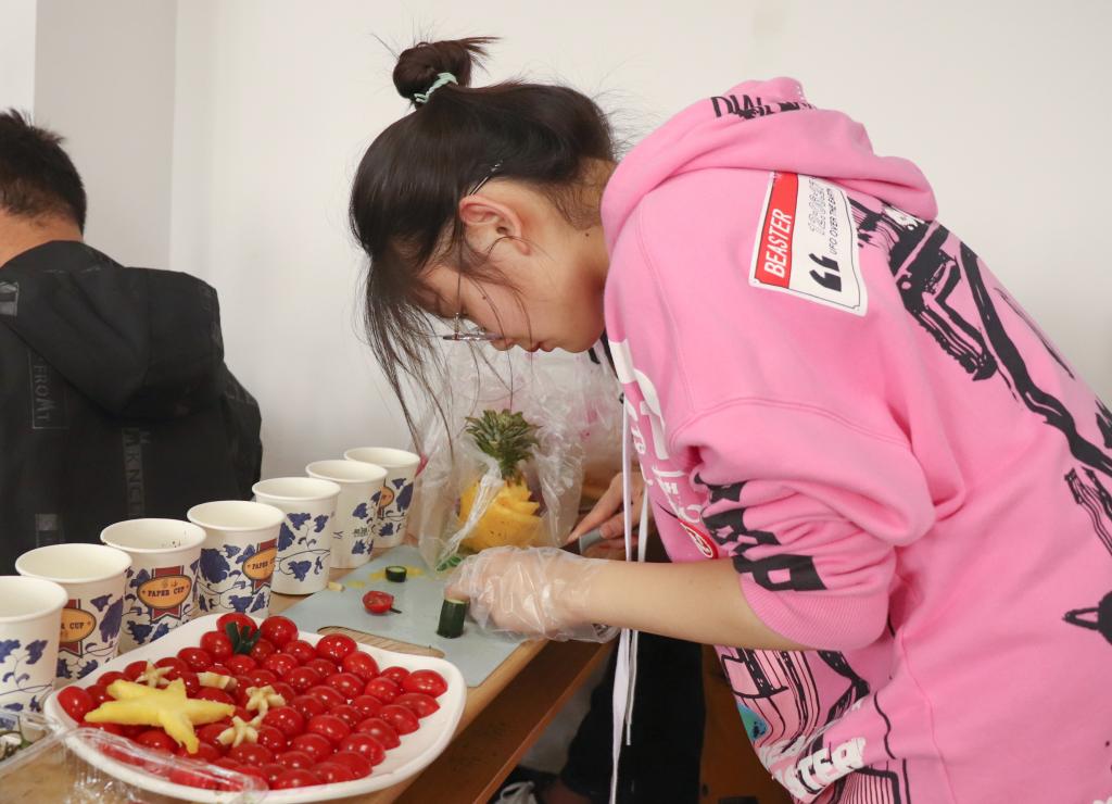 在凉菜制作中,何子旭和同伴合力完成了一道皮蛋豆腐,此前她们在寝室已经尝试做过一次。“看着自己一下午的劳动成果,很有成就感,我们享受到了自己动手的快乐,也体会到了父母做饭的不容易。”何子旭称,当代大学生应多主动进行居家劳动,帮助父母分担家务压力。