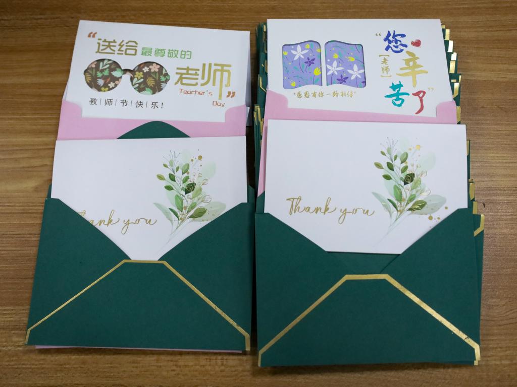 的传统,恰好今年是‘双节共至’,而中秋赏花灯是一种习俗,我们就想手作花灯和手写祝福为教师节增添传统文化的色彩。”张光俊表示,希望他们准备的这份“惊喜”能够为营造尊师重教的校园氛围贡献一份力量,同时表达对老师们最真挚的节日祝福,推动师德师风在校园更好地赓续、传承与发展下去。