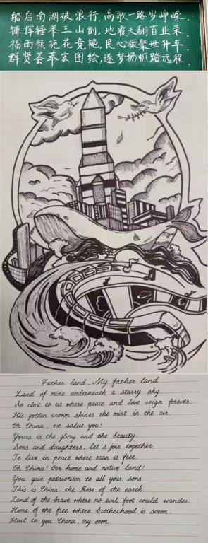 “百载新征胜会开,承前启后聚英才。红船稳驶成旗舰……”面对大赛主题要求,英语专业2021(4)班的董元庆选择书写李文朝的诗词。“这首诗从红船会议开始讲述党的奋斗历程,我很喜欢这首诗,觉得非常美。”她表示,她想借这首诗表达党的奋斗历程的不易,也祝愿祖国繁荣富强。神舟升天、红旗飘扬、高铁开通……简笔画参赛选手自备画笔和水彩,以新中国成立以来取得的成就和标志性事件作画;钢笔字组选手自行选取喜爱的诗歌、散文片段,现场进行中文或英文写作。