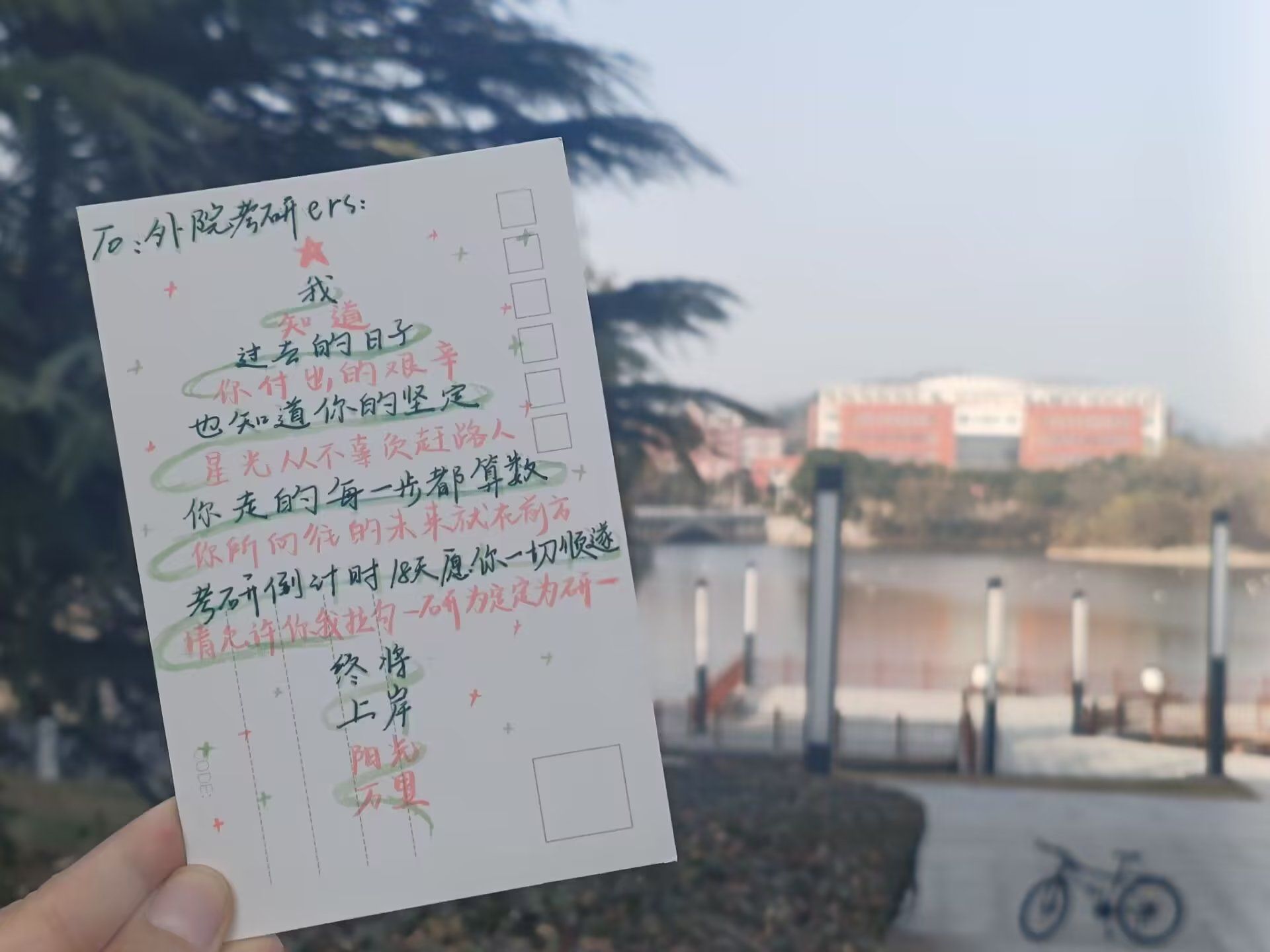 手写明信片,传递暖心祝福。12月1日至5日,开展了为期5天的考研祝福明信片征集活动,学弟学妹们自行领取明信片,将祝福和鼓励的心声化于文字写于纸上。“追光的人,终会光芒万丈。”、“请乘理想之马,挥鞭从此启程,路上春色正好,天上太阳正晴。”一撇一捺饱含着学弟学妹们的殷殷祝福,彰显着同院学子之间的深情厚谊。
