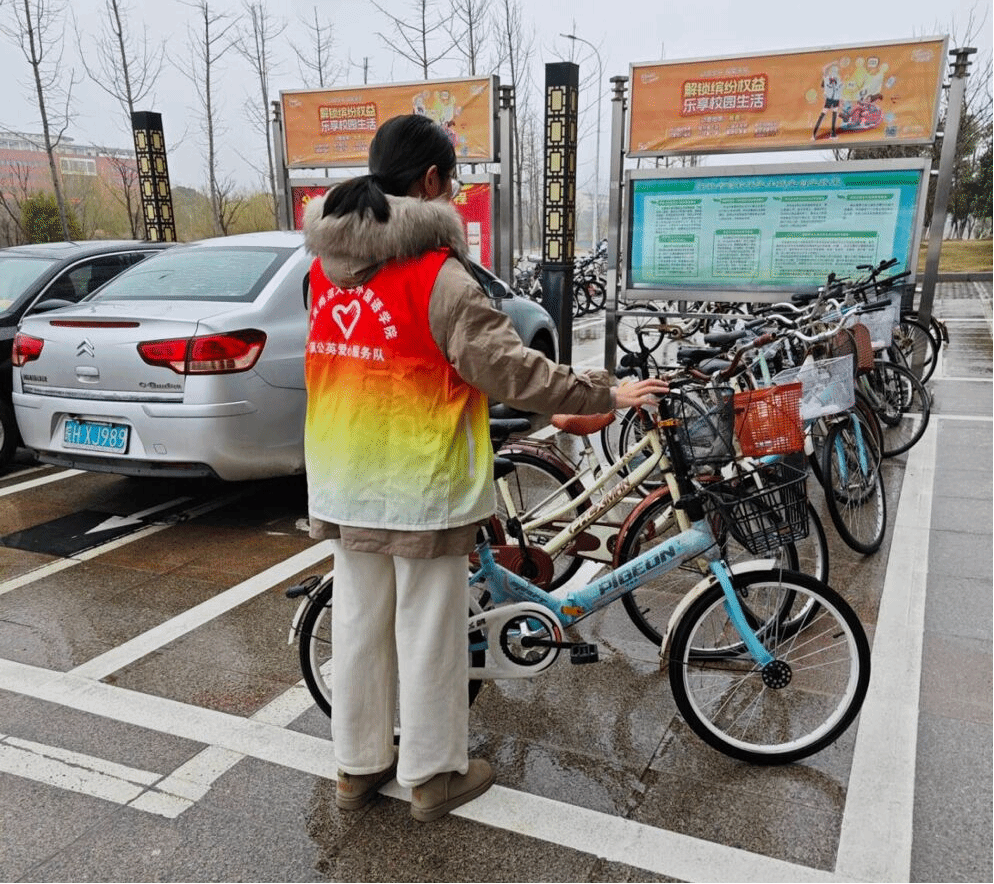 与此同时,学院自行车停放点一群身着红色志愿服的“雷锋们”也在整理自行车的摆放。在细雨中扶起倒下的自行车,并移放在规定区域,志愿者们干劲十足,享受着劳动所带来的快乐,真正实现了理论学习到志愿实践的跨越。