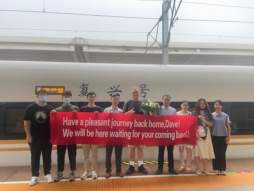 任教近14年的外籍教师Dave回国探亲。院长王先荣、副院长江加宏、国际交流与合作处涂王贝老师和学院师生代表赴安庆火车站为他送行。