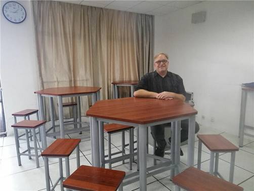 教学楼里,603室是大卫的“专属”教室,这让他颇为骄傲。针对不同的教学需要,这间教室里的桌椅可以自由组合、移动,大卫也能近距离与学生互动。