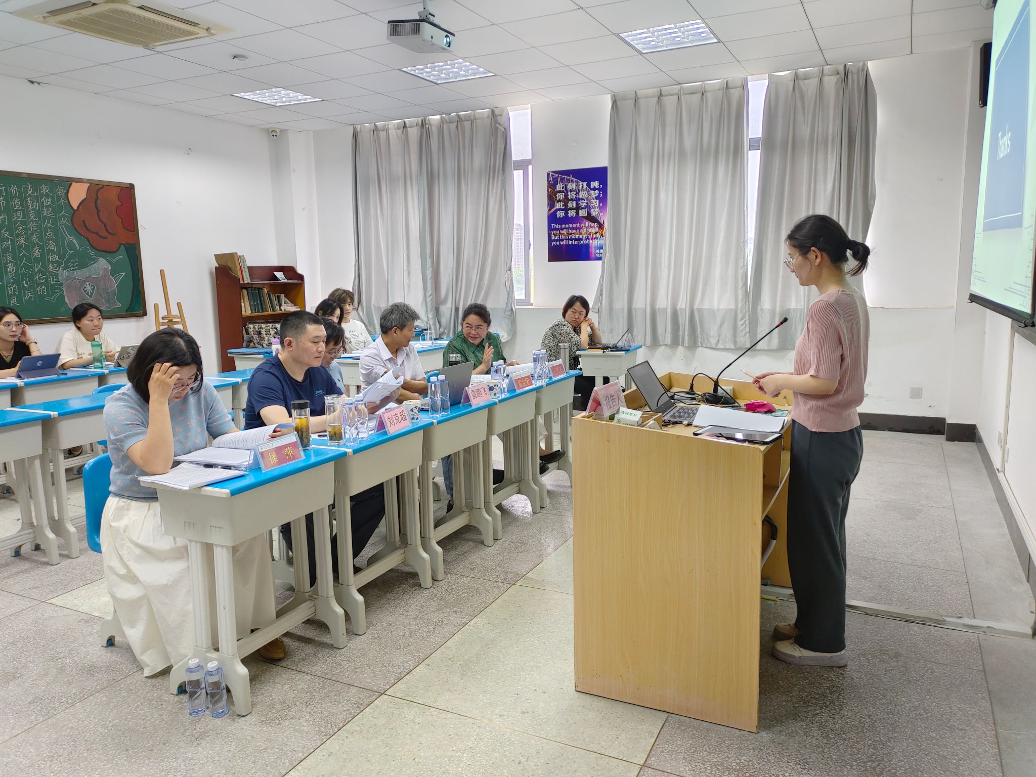 在答辩过程中,2021级学科教学(英语)和翻译硕士(英语笔译)两个专业的29名同学被分为四个小组,依次上台汇报自己的毕业论文。他们围绕研究背景、意义、方法以及结论等方面进行了详尽而深入的阐述。答辩委员会专家认真听取了每位同学的汇报,从选题价值、研究方法科学性、框架结构合理性以及结论有效性等多个维度给予了专业而中肯的评议。