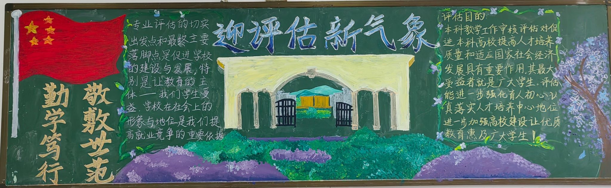 开展以“以评促建 以评促改”为主题的本科教育教学审核评估黑板报评比活动,旨在遵循教育规律,聚焦本科教育教学质量,培养德智体美劳全面发展的社会主义建设者和接班人。